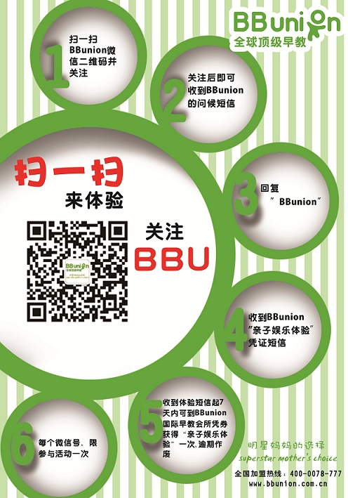 【免费亲子娱乐体验活动】只要打开微信扫一扫我们的二维码,关注我们的微信,就可到会所免费享受一次BBunion最专业的教育顾问亲自主持的“亲子娱乐互动”,名额有限,妈妈们还等什么?赶紧打开微信扫一扫吧,步骤如图序号提示。